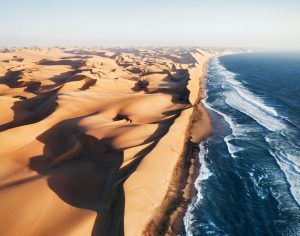 In Namibia, the Skeleton Coast is a beautiful beach well known for its wrecked ships and desolated atmosphere. Due to the Benguela Current, predators such as sharks occupy the water. Additionally, your concern may not be only in the water because there are land predators, such as hyenas and lions, walking along the shore.