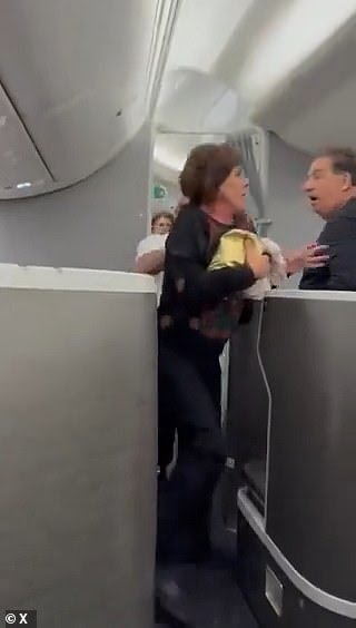“You son of a b**ch, disgusting, you can’t touch me, you don’t know who you’re talking to, you’re going to get screwed. I went to ask why I was late and this [man] threw me out,” she shouted, according to reports. She is escorted toward the back of the plane and continues to argue with the male passenger, prompting another flight attendant to intervene, attempting to calm him.