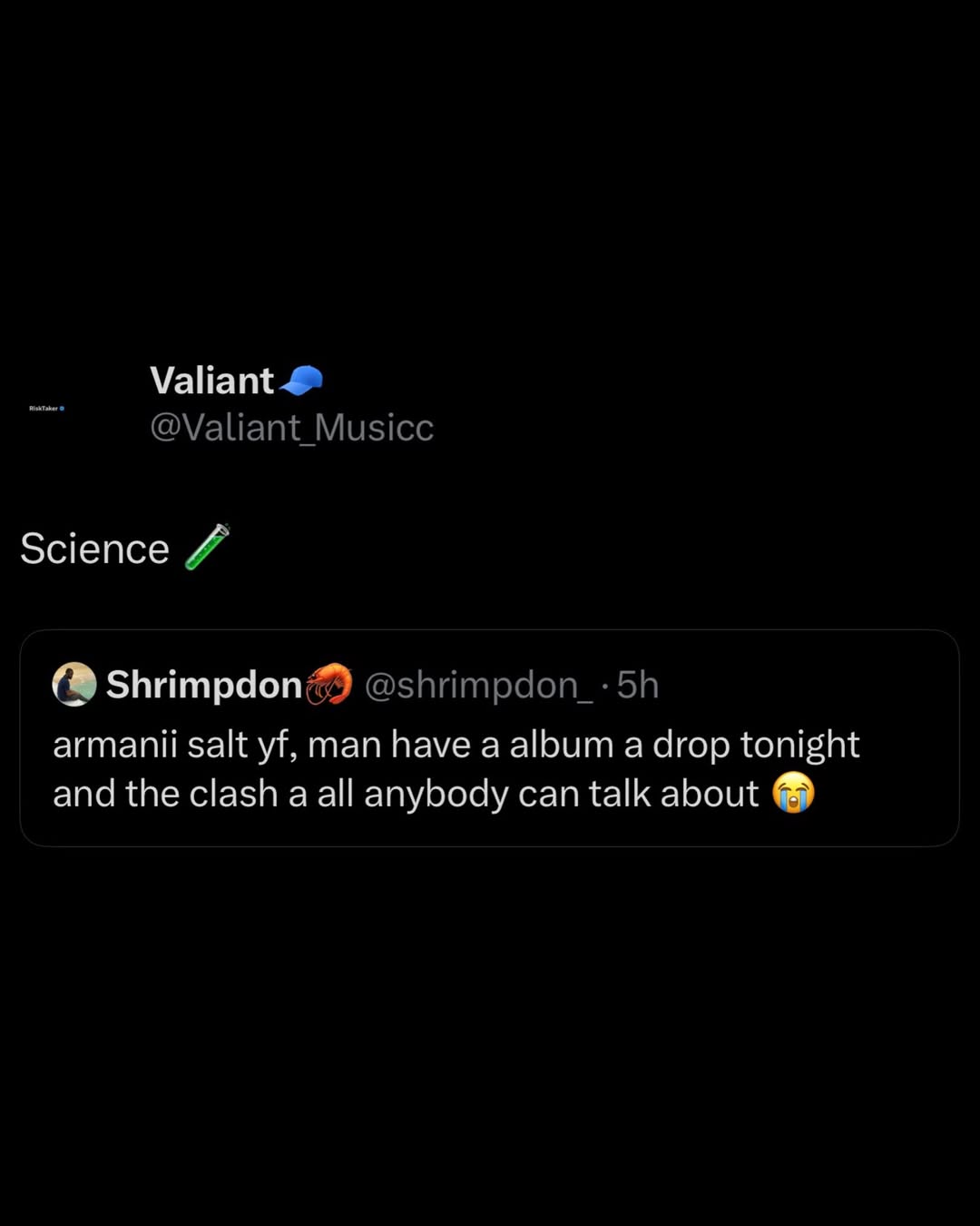 One social media user suggested that the album was being overlooked because fans were focused on the ongoing lyrical clash between Tommy Lee and Masicka, a rivalry that has drawn multiple entertainers into what many describe as a full-blown dancehall warzone. Valiant responded to the tweet with the word “sciance,” implying that spiritual practices were responsible for the album being ignored. This was widely interpreted as a reference to Armanii’s earlier claims that Valiant practised obeah.