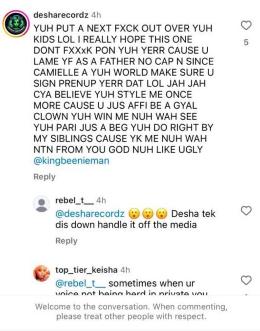 In the comment, Beenie Man was accused of making Camille his top priority while his children were placed lower on the list. Desha, a former dancer of the Jamaican Ravers group, indicated that her father was guilty of doing this in the past with his previous partners. Desha, also known as Desha Ravers, called Camille “A NEXT FXCK OUT” and called her father a “GYAL CLOWN.” She expressed that her father wronged her once more, and she never wants to see him again. Her final request to her father is a plea for him to do right by his other children.