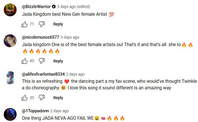 The music video captures ladies sunbathing on a lawn, Jada Kingdom lounging on the grass and floating in a pool. The visuals feature many provocative scenes, from the ladies caressing their bodies in the water to Jada Kingdom licking a fruit. The favourite scene for many viewers is the smooth dance choreography featuring Jada Kingdom with the video vixens.