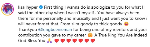 Lastly, she extended her gratitude to him, saying, “Thankyou @kingbeenieman for being one of my mentors and your contribution you gave to my career .” At the end of the apology, she acknowledged him as a “True King.”
