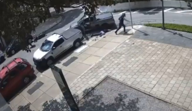 The pickup truck’s driver seemingly attempts to exit the vehicle to detain the suspect just as he is passing by. Almost immediately, the suspect withdrew a handgun and fired multiple shots in the direction of the driver.