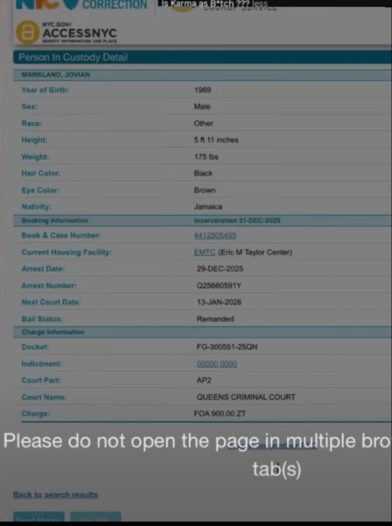 The day after his arrest, Markland was reportedly brought before the Queens Criminal Court, according to the public records on the New York State Unified Court System. During that appearance, he was ordered held on remand with bail, with a follow-up court date set for January 13, 2026. He did not secure a bond until late January.