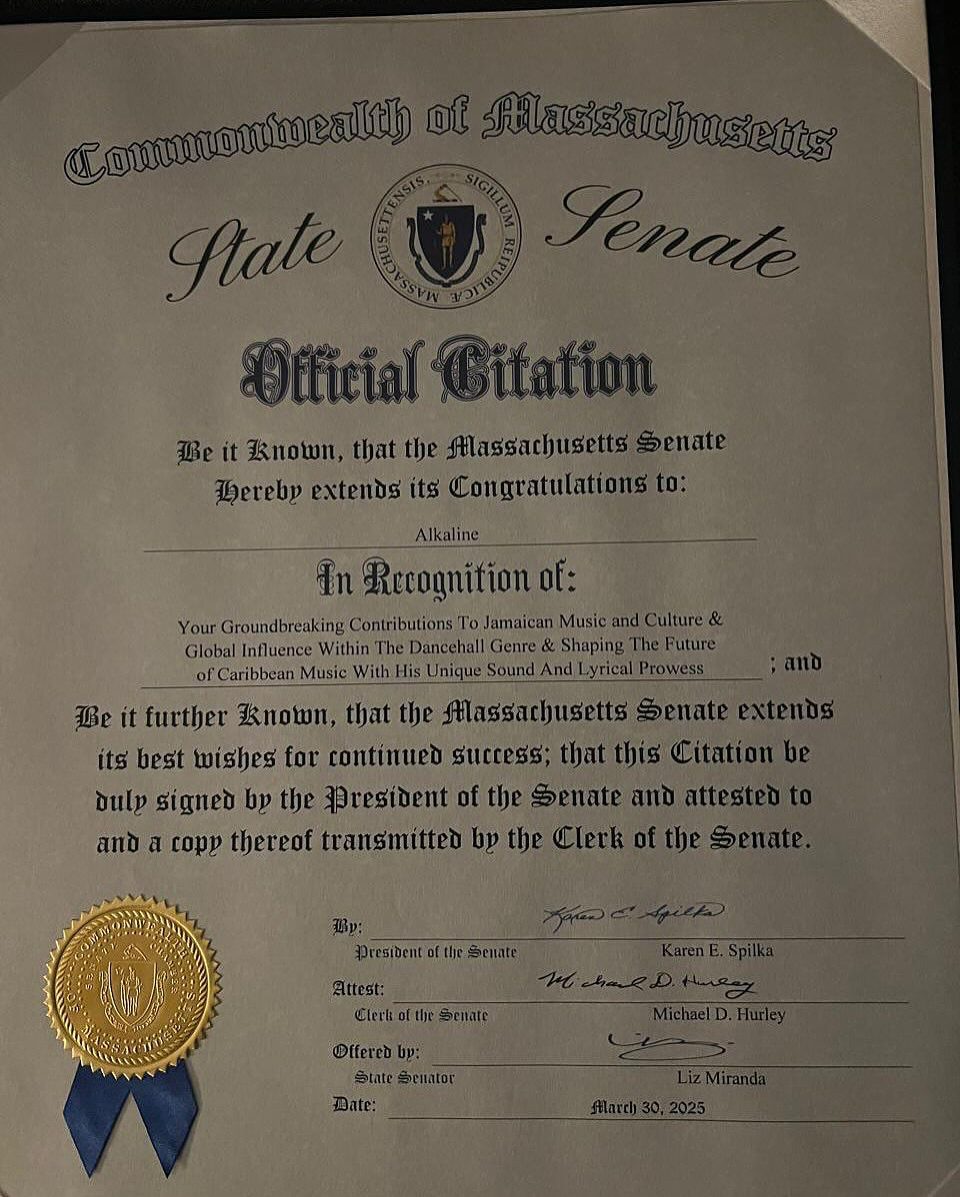 Following a magnificent show that thrilled attendees, the Kingston native was given a prestigious citation from the US state of Massachusetts, marking his contribution to dancehall. Alkaline has spent over a decade transforming the dancehall scene with his innovative sound. He is renowned for songs like Formula, ATM, City, Champion Boy, Sauve, and Afterall, all of which resonated widely with his fans.