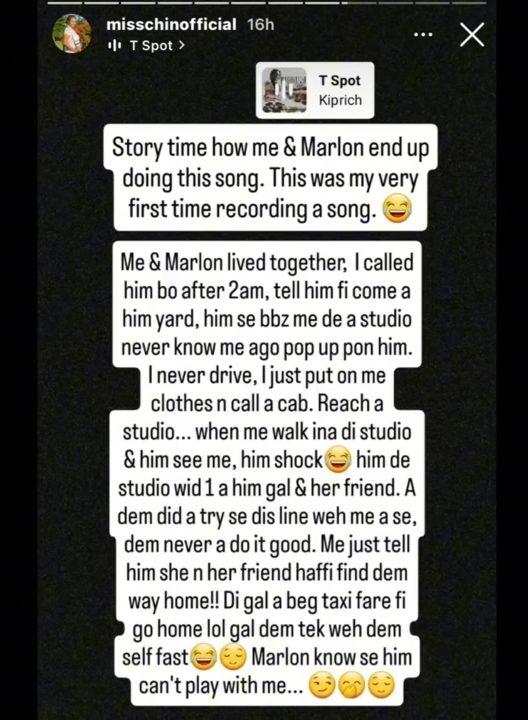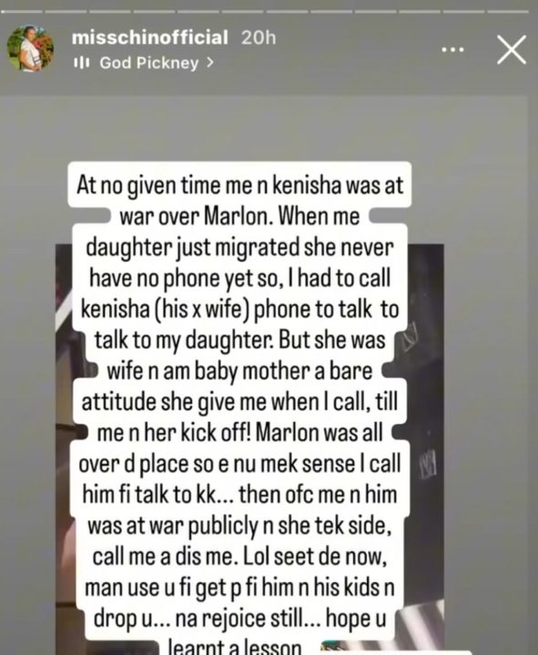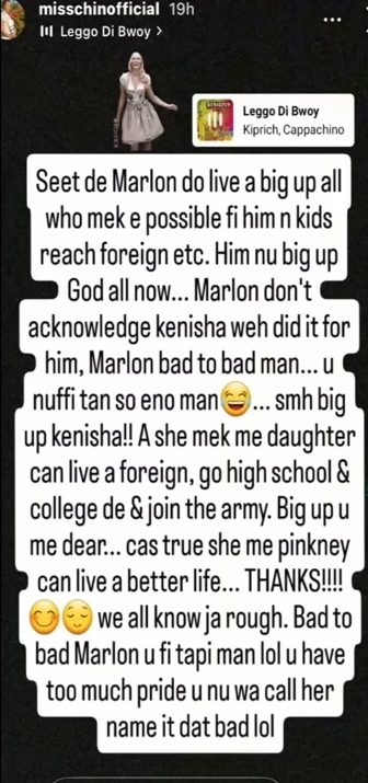 In another post, Miss Chin accused Kiprich, whose real name is Marlon Plunkett, of being ungrateful to God for helping him over the years. She also highlighted his ex-wife, Kenisha, crediting her for giving their daughter the opportunity to migrate and build a better life abroad. According to Miss Chin, Kenisha played a key role in ensuring her daughter’s future, and she criticised Kiprich for not acknowledging that contribution.