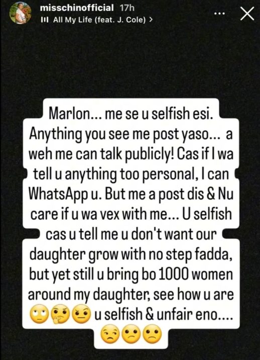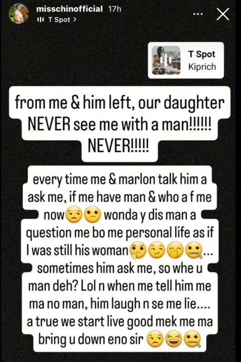 In a separate post, Miss Chin expressed frustration at what she described as KipRich’s selfishness, accusing him of hypocrisy for bringing different women around their daughter, despite previously stating that he did not want her raised by a stepfather. She also claimed he continues to question her personal life, even though they are no longer together.