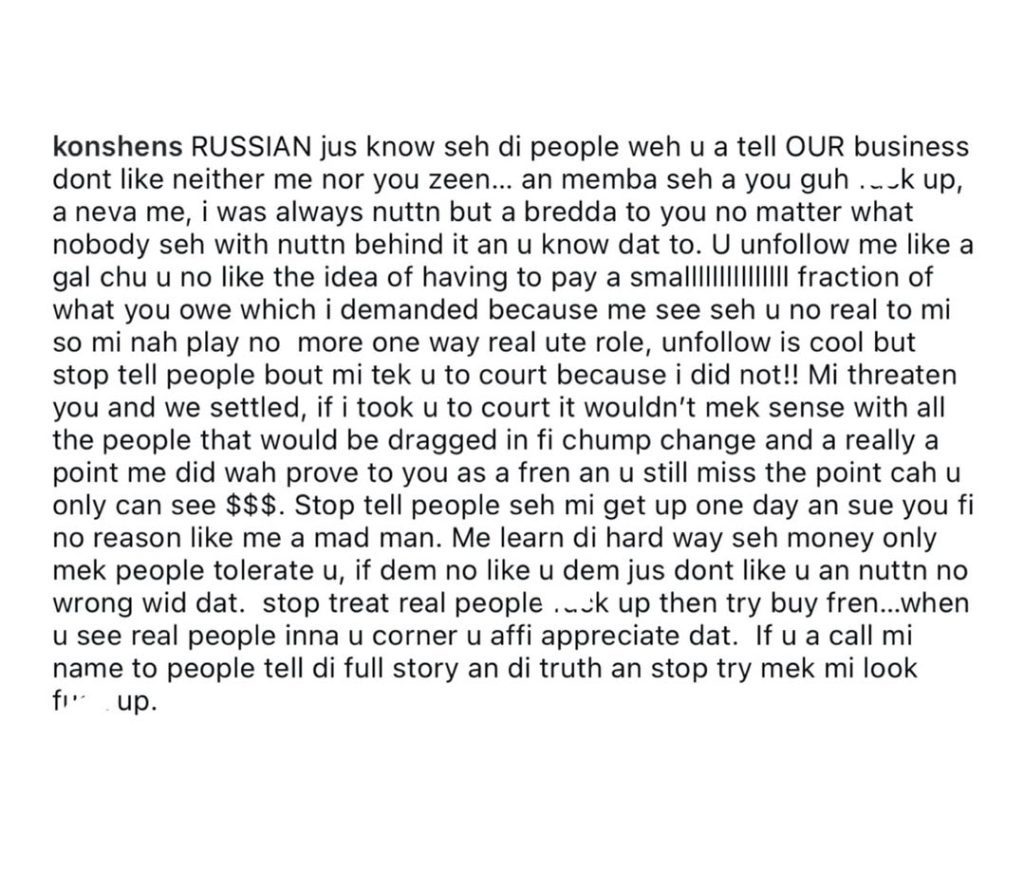 “Russian, just know seh di people weh u a tell OUR business don’t like neither me nor you,” Konshens wrote, suggesting that Rvssian has been discussing their fallout with individuals outside their circle. Konshens also made it clear that the source of the issue stemmed from money owed to him, claiming that he only demanded a “small fraction” of what he was allegedly due. He claimed that Rvssian was telling people he took legal action against him and while he had threatened to do so, they had reached a settlement without ever going to court.