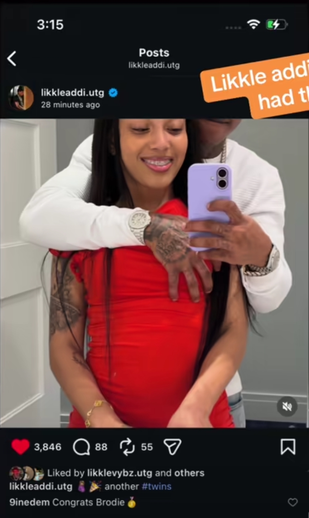 The young entertainer shared a photo on social media showing him embracing a young woman, accompanied by the caption, “another #twins.” The announcement immediately caught attention, as Likkle Addi already shares a daughter, said to be about one year old, with a different woman.