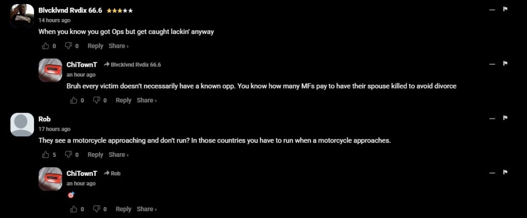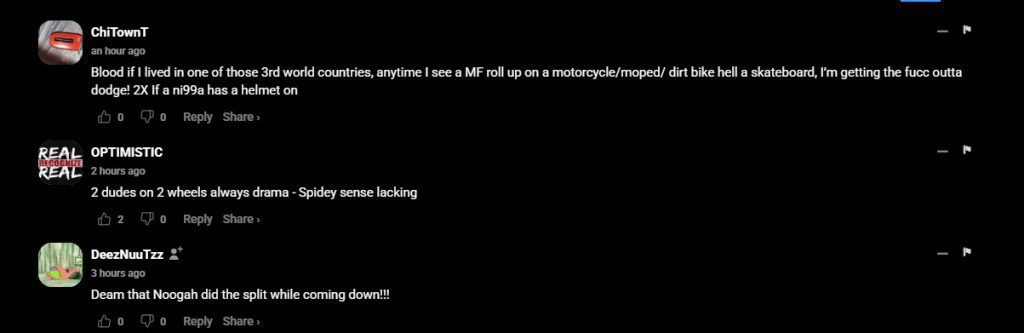 The video has garnered mixed responses from viewers, with many questioning why he stood still rather than ran away when the motorcycle arrived. One viewer, ChiTownT, commented online, “Blood if I lived in one of those 3rd world countries, anytime I see an MF roll up on a motorcycle/moped/dirt bike, hell, a skateboard, I’m getting the fucc outta dodge! 2X If a ni99a has a helmet on!”