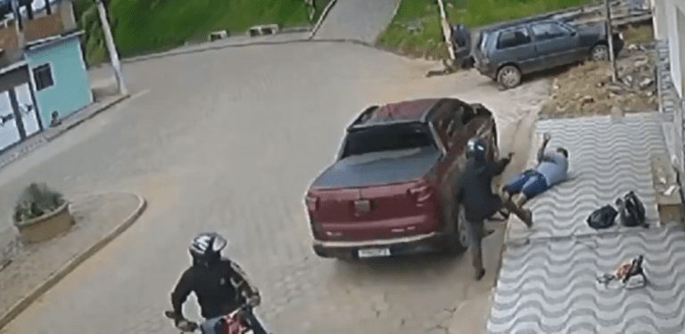 The footage shows a deadly shooting along a roadside in an unidentified location. In the footage, a group of men can be seen standing near a pickup truck. One man, wearing a grey shirt, is among them. Without warning, a motorcycle with two gunmen rides up to them and comes to a stop nearby. A rider dismounts swiftly and, without hesitation, aims a handgun at the man in the grey shirt, firing several shots.