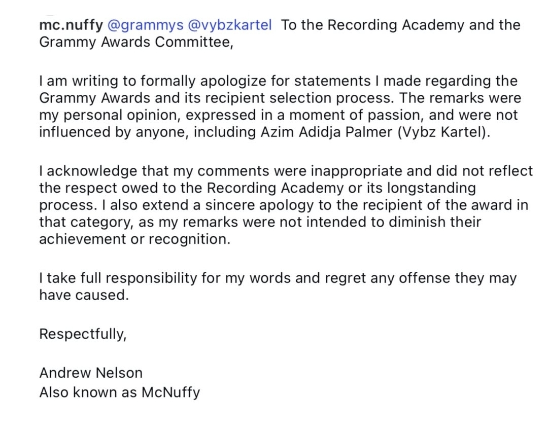 In the statement, MC Nuffy formally apologized to the Recording Academy and the Grammy Awards Committee,. Heacknowledging that his remarks were inappropriate and made in a moment of heightened emotion. He emphasized that the comments reflected his personal opinion and were not influenced by Vybz Kartel, whose real name is Azim Adidja Palmer.