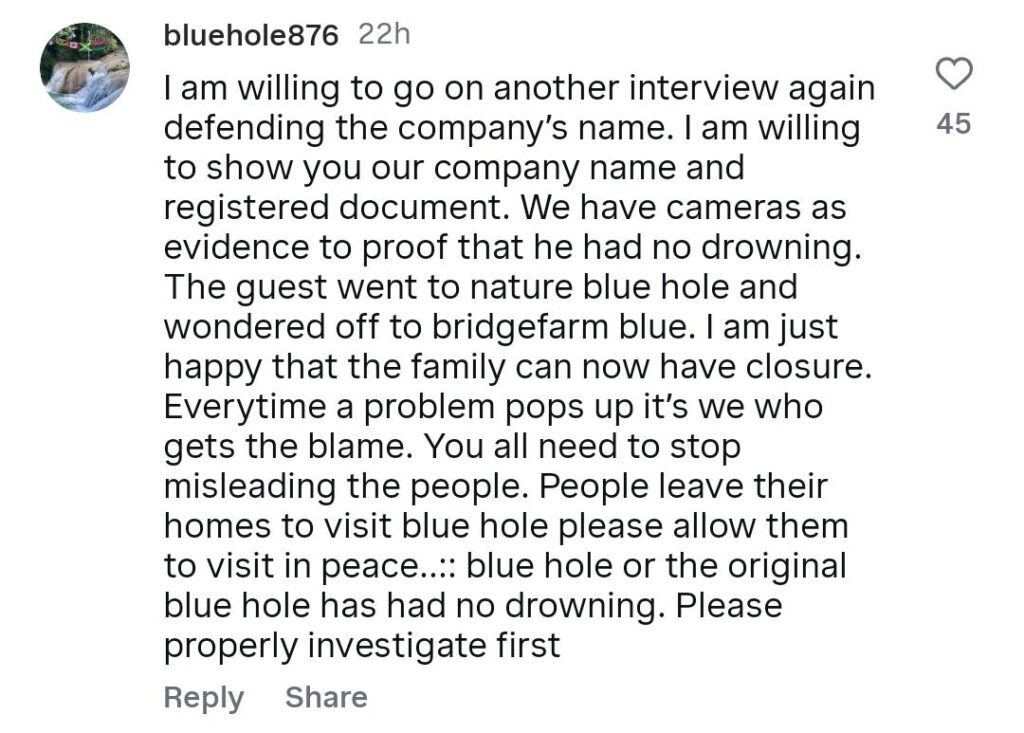 The company also addressed the matter in the comment section of a news report, claiming that there is often confusion surrounding the name “Blue Hole,” as multiple attractions in the area use similar branding. Representatives argued that this has led to their business being wrongly associated with incidents they say did not occur on their property.