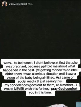 “As I came on social media & just seeing this… my condolences goes out to them, as a mother… I would NEVER wish this for her. I pray God comfort you in this time,” the post concluded.