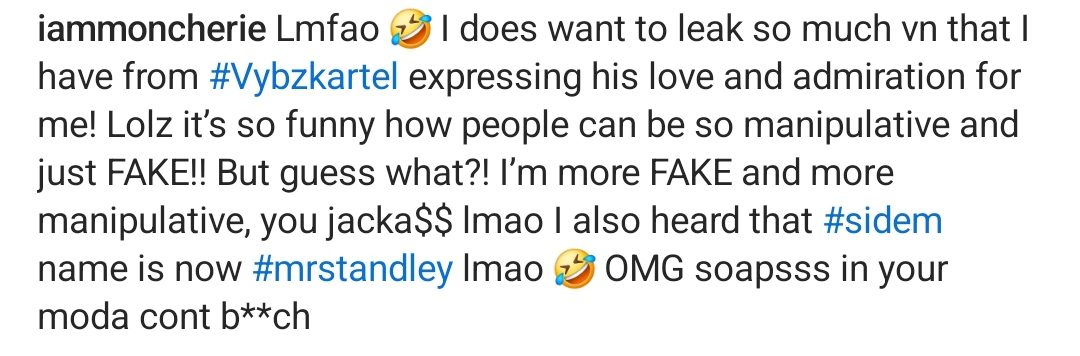She wrote, “Lmfao I do want to leak so much vn that I have from Vybz Kartel expressing his love and admiration for me! Lolz, it’s so funny how people can be so manipulative and just FAKE!! But guess what?! I’m more FAKE and more manipulative, you jackass. $$ lmao I also heard that #sidem’s name is now #mrstandley lmao. OMG soapsss in your moda cont b**ch.”