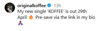 Koffee kept her fans in the loop by announcing her song’s release date for April 29. The Toast hitmaker made sure her fans knew what was coming when she took to Instagram on Tuesday afternoon.