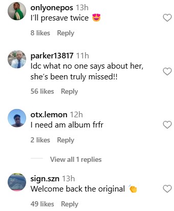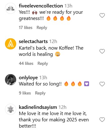 Her loyal fans celebrated her return in the comments, with one declaring the world was “healing” with both Koffee and Kartel back in the mix. Another fan also joked about pre-saving the song twice out of sheer anticipation. The comment section quickly became a vibrant display of emojis, including flames, hearts, flags, and prayer hands, highlighting just how deeply her absence was felt.