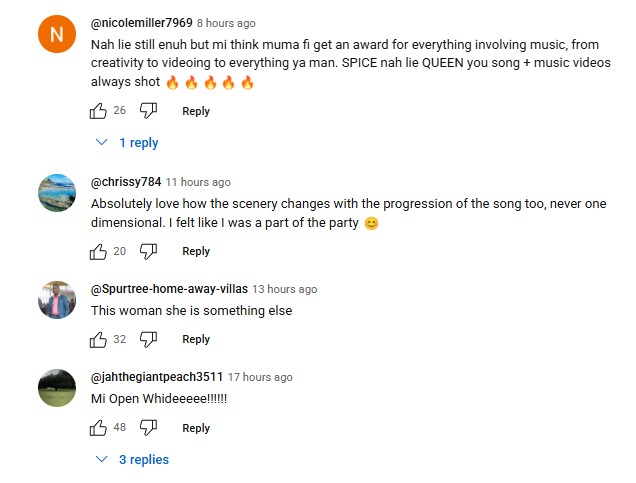 Another (@nicolemiller7969) declared that Spice deserves awards for every aspect of her music, from songwriting to video production. Others could not get enough of Spice’s bold lyrics and fierce delivery. Spice’s status as the reigning “Queen of Dancehall” was reaffirmed repeatedly in the comments. Some fans like @nyopegideon7659 and @gembenjamin7942 applauded her lasting impact and style.