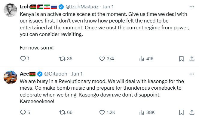 One person stated, “Accept our shenseea apologies.” Another explained, “Kenya is an active crime scene at the moment. Give us time we deal with our issues first. I don’t even know how people felt the need to be entertained at the moment. Once we oust the current regime from power, you can consider revisiting. For now, sorry!”