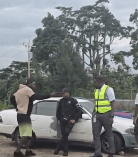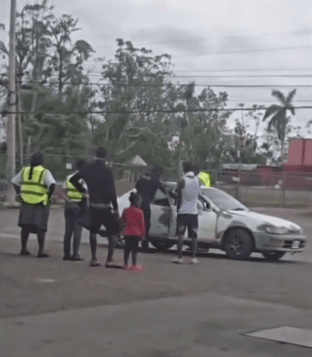 Among the group, one of the male employees wearing a vest marked “Transport Authority” is shown standing near a vehicle where the alleged disgruntled motorist is. A heated exchange is unfolding, during which the employee reaches toward his waist and pulls out an object while instructing a man at the scene to “Step back, sir.”