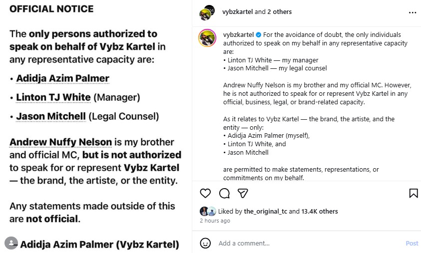 In the statement, Kartel listed the only individuals permitted to represent him publicly as himself, his manager Linton “TJ” White, and his legal counsel Jason Mitchell. He acknowledged MC Nuffy as his brother and an official emcee, but made it clear that his opinions do not reflect the views of the artiste or the Vybz Kartel brand.