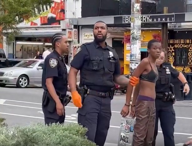 The situation drew a heavier police presence moments later. Several NYPD officers approached the woman just a few blocks from the store, cornering her on the street. She was searched, handcuffed, and placed into the back of a patrol car as onlookers filmed the arrest.