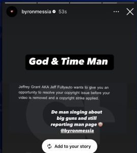 However, Byron is now facing the consequences of a copyright claim filed by Jeff Fullyauto. Byron took to social media on Wednesday to share the song’s removal and respond to critics. In posts he shared in his Instagram Story, Byron wrote, “God Alone Knows” and “Unuh Win.”