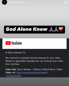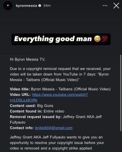 The posts featured screenshots of the removed music video on YouTube and a one-week notice from the streaming platform. The alert notified Byron that the video would be removed due to a complaint filed by Jeffrey Grant, otherwise known as Jeff Fullyauto. The music video for Talibans II featuring Burna Boy was also removed.